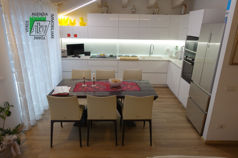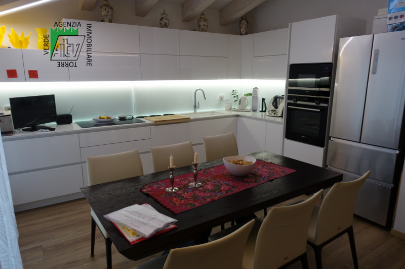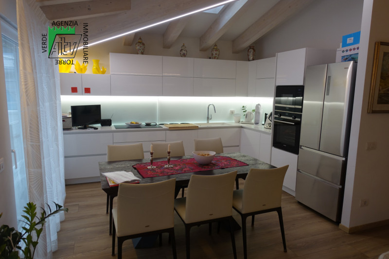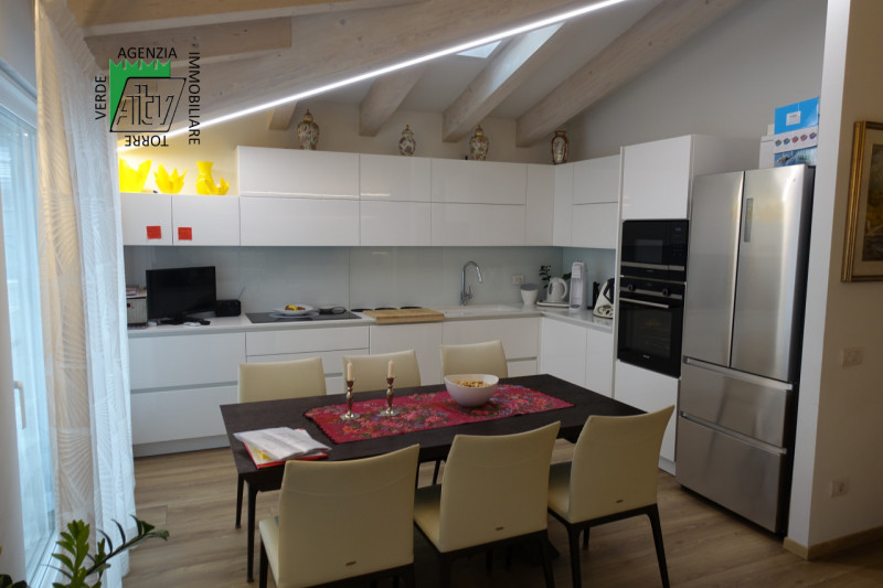 In una delle zone più ricercate di Mezzolombardo, proponiamo in vendita un esclusivo attico di 125 mq situato al terzo piano di una palazzina moderna costruita nel 2021. L’appartamento si distingue per il suo design contemporaneo e la luminosità degli ambienti grazie alle grandi finestre e ai soffitti con travi a vista. Il cuore della casa è lo spazioso soggiorno-cucina open space da ben 34,5 mq: qui troviamo una cucina angolare dal gusto raffinato, completamente arredata su misura con mobili laccati bianchi lucidi, elettrodomestici di ultima generazione, illuminazione led integrata sul piano lavoro ed eleganti dettagli decorativi che conferiscono unicità all’ambiente. Dalle ampie finestre con aperture scorrevoli si accede direttamente allo spettacolare terrazzo abitabile di circa 41 mq dotato di pergotenda ottimale per vivere il terrazzo nelle mezze stagioni e blocco cucina esterno perfetto per pranzi all’aperto godendo della splendida vista aperta sulle campagne circostanti. La disposizione interna comprende inoltre due camere da letto (matrimoniale e doppia), doppi servizi finestrati, locale lavanderia/ripostiglio. Il riscaldamento è a pavimento regolabile tramite termostato ambiente dedicato in ogni stanza ed impianto clima già installato. Completa la proprietà uno spaziosissimo garage doppio privato al piano interrato oltre ad una spaziosa cantina. Soluzione pronta da vivere! Nel prezzo sono inclusi arredo cucina completo di elettrodomestici top gamma, la veranda e le tende da sole con aperture automatizzate sul terrazzo, la cucina sul terrazzo, arredi nel ripostiglio/lavanderia, arredi dei bagni, armadio nella stanza matrimoniale. Non lasciarti sfuggire questa opportunità unica: contatta subito Agenzia Immobiliare Torre Verde per fissare una visita o ricevere maggiori informazioni! --- annuncio pubblicato con GESTIONALEIMMOBILIARE.it